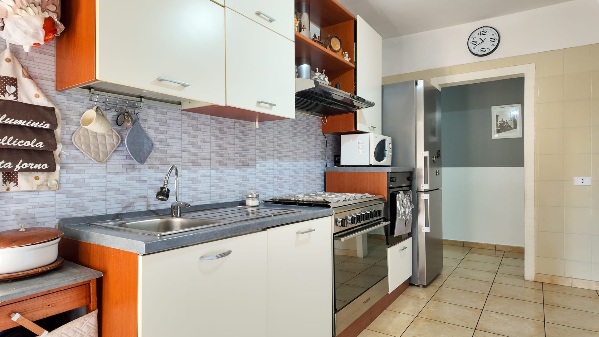 L'appartamento si apre su un disimpegno con a sinistra la zona giorno composta da cucina abitabile, soggiorno doppio e bagno di servizio, sempre dall'ingresso proseguendo diritti ci si porta in zona notte con tre comode camere e bagno padronale.