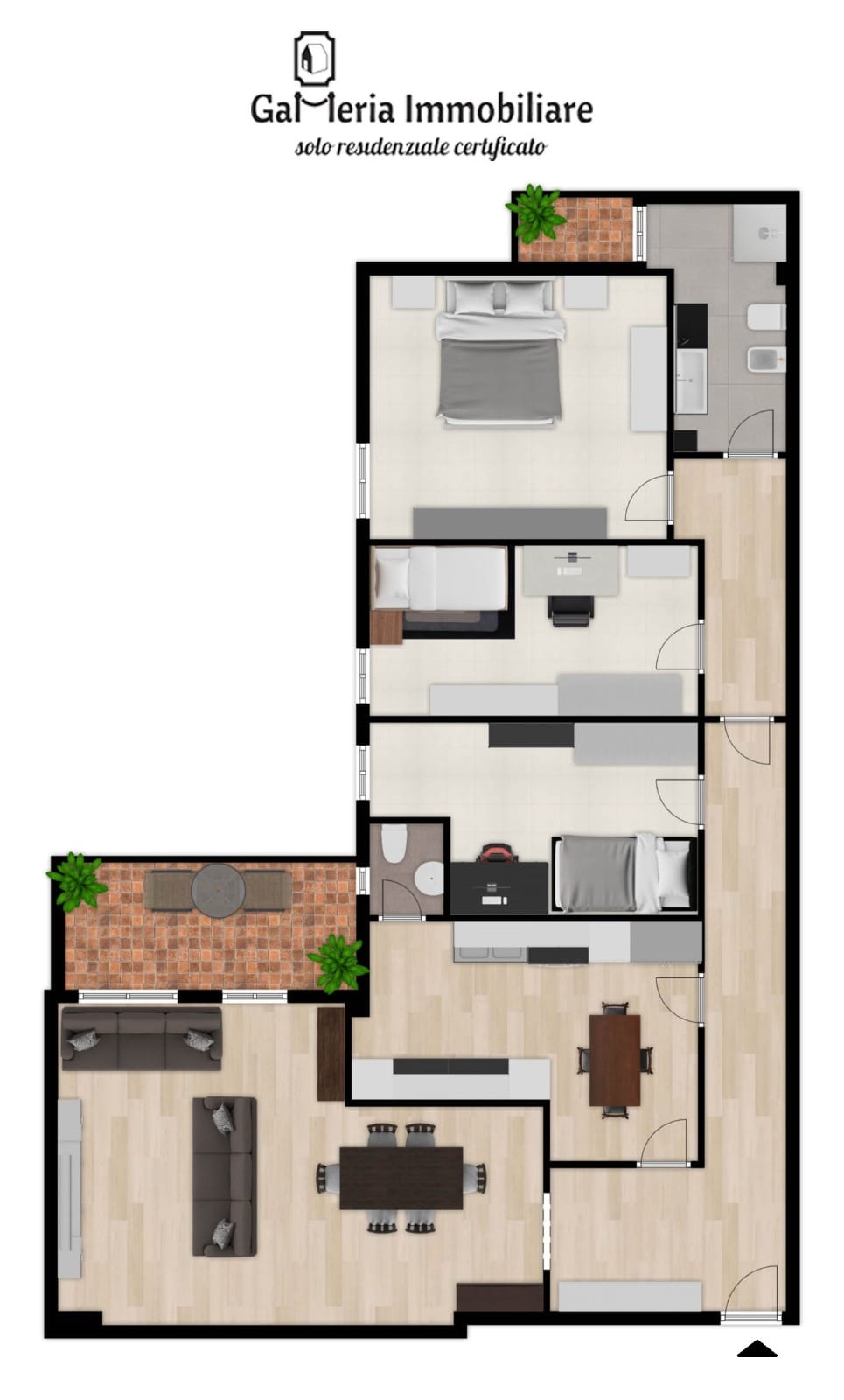 L'appartamento si apre su un disimpegno con a sinistra la zona giorno composta da cucina abitabile, soggiorno doppio e bagno di servizio, sempre dall'ingresso proseguendo diritti ci si porta in zona notte con tre comode camere e bagno padronale.