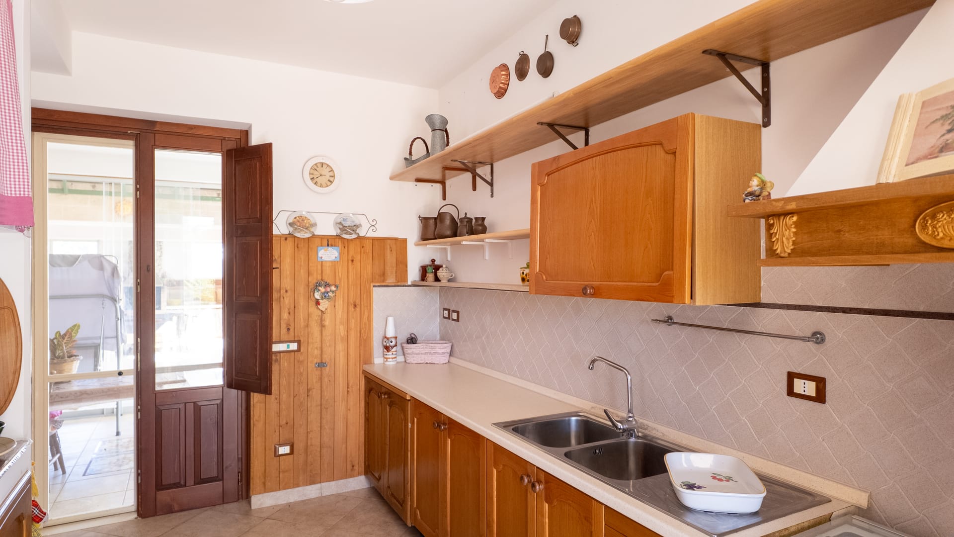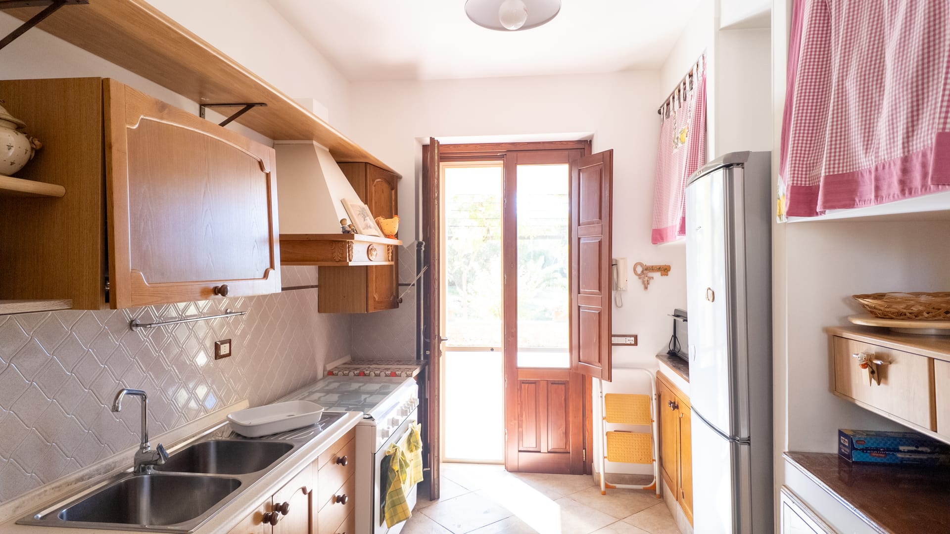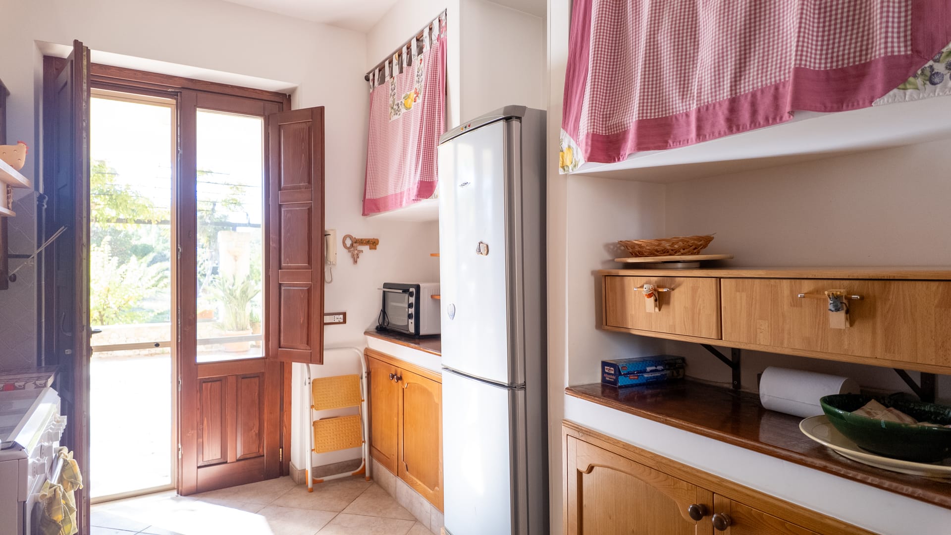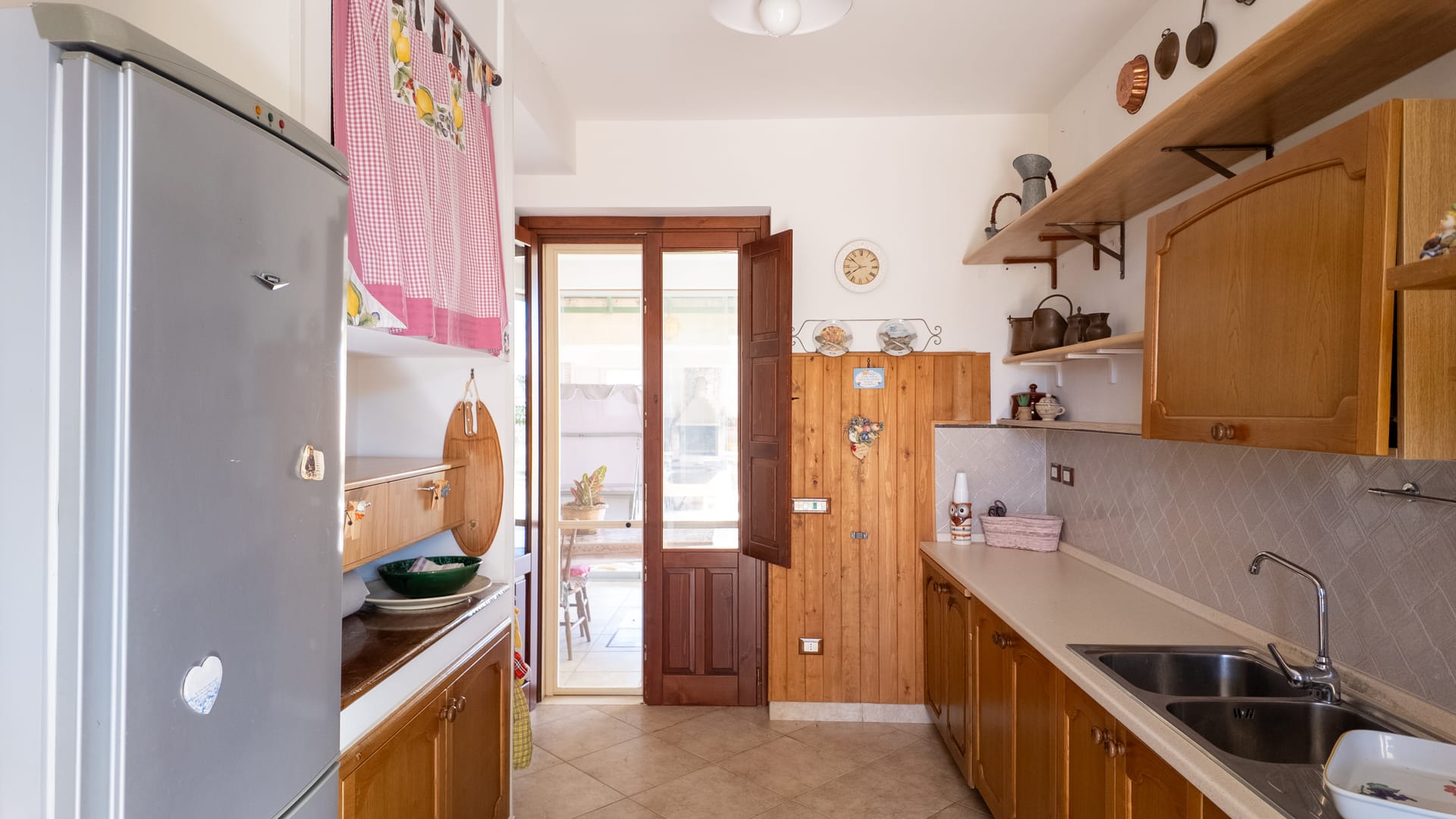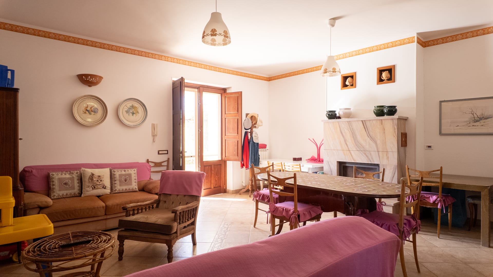 Dopo aver attraversato un suggestivo porticato, gli interni accolgono in un ampio soggiorno, impreziosito dal termocamino, che funge da spartiacque naturale tra le due aree della casa: